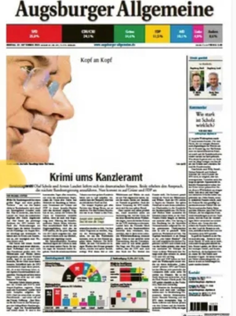 Almanya’da haftasonu yapılan seçimlerin ardından Augsburger Allgemeine bu manşetle yayımlandı: Kafa kafaya… Merkezin solundaki SPD’nin lideri Olaf Scholz ile sağındaki CDU/CSU’nun başındaki Armin Laschet sandıktan böyle çıktı. Bizde olsa, ‘burun farkıyla’ derdik; nitekim görselde Scholz hakikaten burun farkıyla önde.
