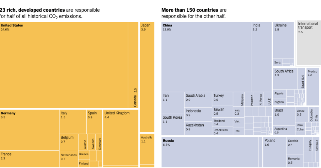 Son 170 yılda dünya karbon emisyonlarıyla 1.1 derece ısınmış. Grafiklerde kimin ne kadar rolü olduğunu görüyorsunuz. Birinci tablodakiler tarihi sorumlular. İkinci tablodakiler de geriye kalanlar. Biz de ikinci tablodayız. Her halükârda birinci tablonun tuzu daha kuru… Onların da başına iş açılacak ama birazcık kaçış payları var.