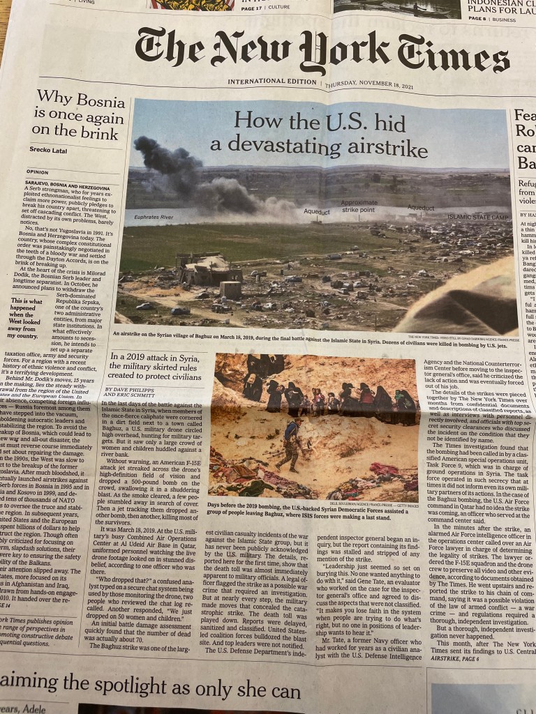 New York Times, Amerikan ordusunun Irak’ta çoğu kadın ve çocuk yetmişe yakın sivili nasıl göz göre vurduğunu haber yaptı. 2019’un mart ayında, IŞİD ile savaşın son günlerinde, Fırat kıyısında, Baguz kasabası yakınlarında bir hava saldırısı… Haberden okuyoruz: Görünürde bir tehdit yokken; bir drone, ırmak kıyısında oturmuş bekleşen insanların görüntülerini alırken ve bu görüntüler ABD’nin Katar’daki üssündeki birimler tarafından bire bir izlenirken, birdenbire bir F-15 geliyor, bombalarını savunmasız sivillerin üzerine bırakıp gidiyor… Katar’daki subaylar bile neye uğradıklarını şaşırıyor; olay silsile şeklinde yukarıya gidiyor; görüşüne başvurulan bir askeri hukukçu bunun savaş suçu olduğuna dair hüküm veriyor, meseleyi raporluyor.
