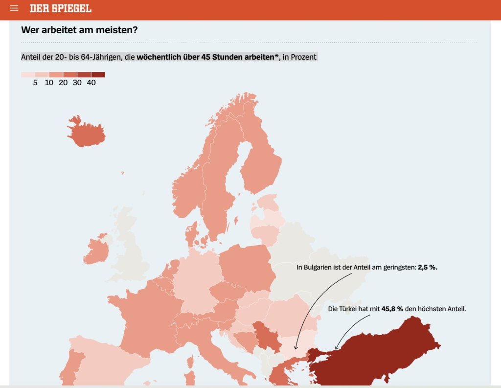 Avrupa’nın en çok çalışanlarını gösteriyor. Çalışkanlık, verimlilik vs bir kenara en çok çalışan ülke Türkiye…. Türkiye’de 20-64 yaş arasında haftada 45 saatten çok çalışanların oranı yüzde 45.