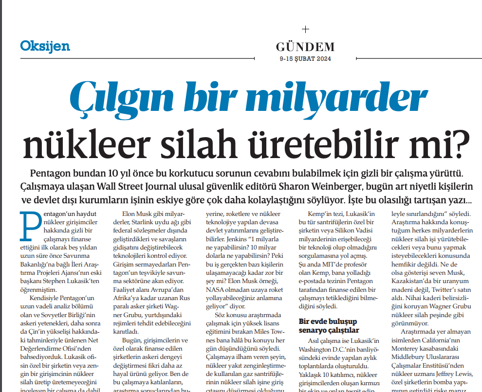 Gazete Oksijen’de, “Çılgın bir milyarder nükleer silah üretebilir mi?” başlıklı bir yazı okudum. Wall Street Journal’ın ulusal güvenlik editörü Sharon Weinberger’in kendi gazetesindeki makalesinin tercümesi… Weinberger, makalesinde hem birtakım akademik araştırmalara referans veriyor hem de nükleer çalışmaların tarihi seyrinden bahsediyor. Ulaştığı sonuç şu; evet birtakım zenginler bu yollara sapabilirler. Ya da birtakım devletlerle gizli ortaklıklara gidebilirler. Mesele seyreltilmiş uranyuma sahip olmak… O da parayla, güçle ve ortaklıklarla aşılabilecek bir mesele.