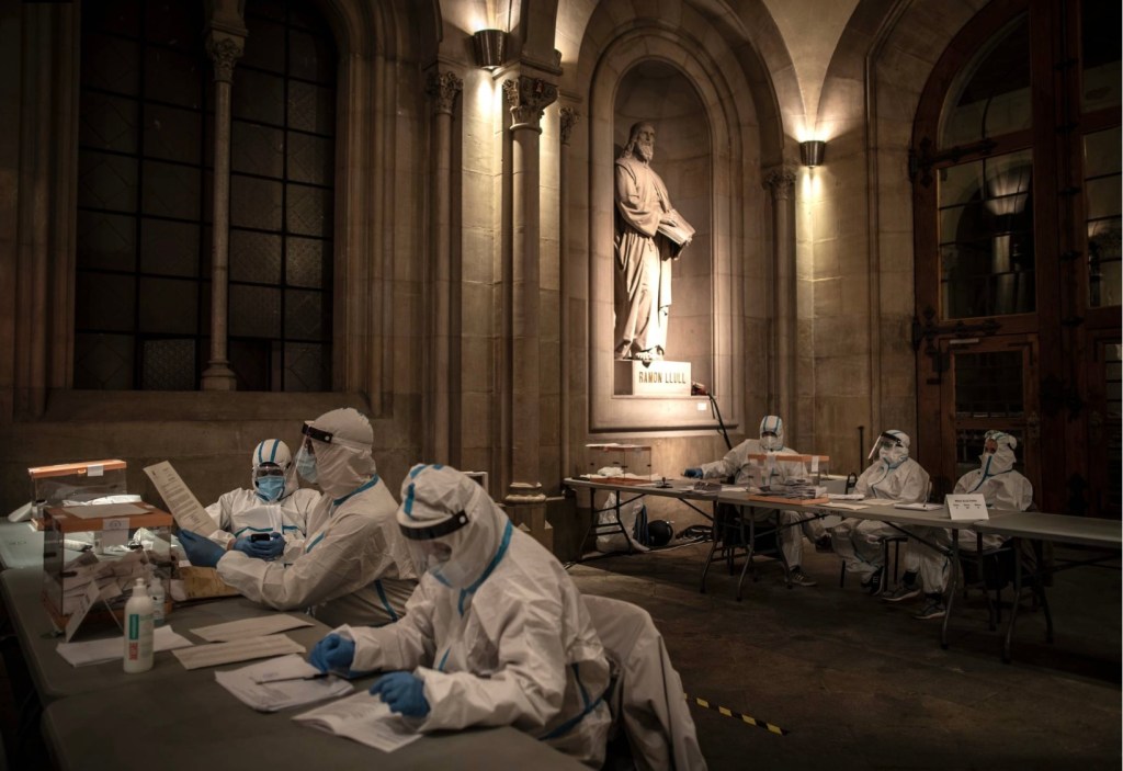 Ama kuruldu. İşte korona testleri pozitif çıkanların da oy verebildiği Katalan seçimlerinde sandıkların hali. Başkanıyla müşahidiyle koruyucu elbiseleri kuşanmış Katalan halkının ferasetini kayda geçiriyorlar. Bunu da görmek varmış. Zamanlar hakikaten pek tuhaf.