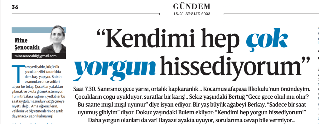 Mine Şenocaklı’nın Oksijen’deki haberinden… Yaz saati uygulamasında ısrarcı olunmasından dolayı sabahın köründe uyanıp yollara düşen çocuklarla konuşmuş. İçlerinden biri “kendimi hep yorgun hissediyorum” diyor.