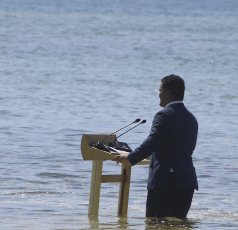 Bu şaka falan değil. Artık uzun vadeli bir şey de değil. Gelecek geldi. Pasifik ülkesi Tuvalu’nun dışişleri bakanı Simon Kefe ülkesinin batmak üzere olduğunu anlatmak için dizlerine kadar suyun içindeyken İklim Zirvesi’ne bağlandı.