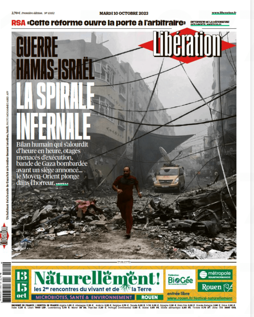 Batı’da tarafsız bir yayıncı bulmak zor. Bu konuda en üste Fransa’nın Liberation’u yazılır bence. 7 Ekim saldırılarının sonrasında iki yayın…. İki tarafın trajedisi de kapak.